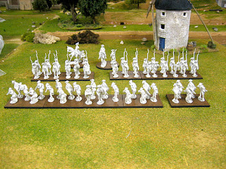 I have a couple more AWI units primed and ready to go on my painting table this evening. The first one will be a regiment in firing line poses using a mix of Fife & Drum Continentals and Militia. According to one of my friends in the UK, it was not uncommon for new recruits to join the regiment and sport their own civilian clothes for awhile. Supplying new uniforms for a regiment was a hit and miss sort of thing.