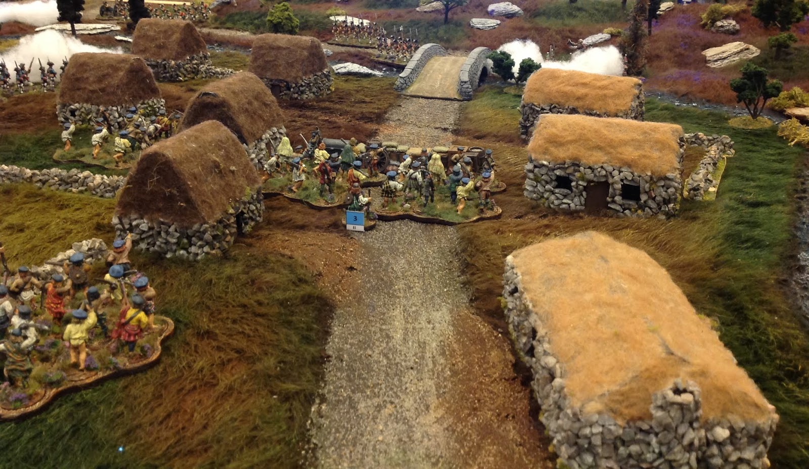 The village of Dunkeld - very nice use of the Teddy Bear Fur concept for the ground cloth. The Highland Black Houses where made by gluing pebbles onto a cardboard frame. Felt cloth was used to make the thatched roofs. The barrel markers denote entry points for troops onto the table. |
